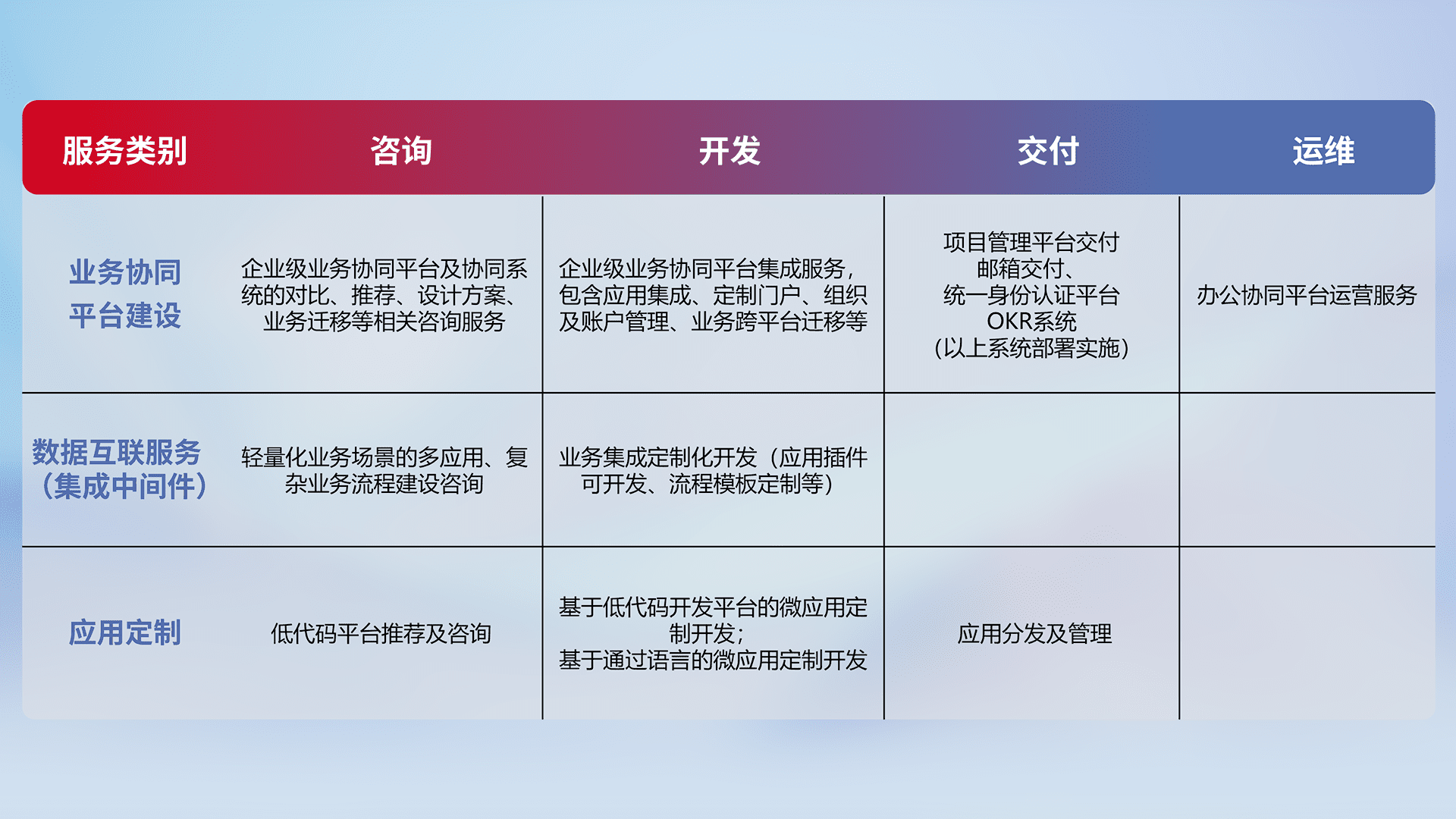 针对钉钉、、、、企微、、IDaas等平台级产品提供产品的规划、、方案、、交付、、、定制化开发等服务,,,,实现如统一协同办公、、、、智能客户服务、、、混合会议管理、、、、智能数据查询、、、等业务场景,,,,实现数字化转型。。