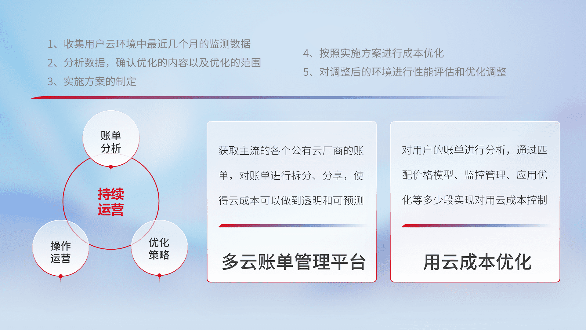 通过多云纳管,,,,以统一的资源数据模型把客户的云资源进行抽象和封装,,,进而实现对多云资源的统一操作,,,,保障云资源管理的可靠性、、、稳定性与可用性。。。。量身定制化运维内容,,配置、、开发运维、、、补丁管理、、备份、、监控、、、认证和访问管理、、审计和日常巡检等,,,保障在用云过程中的可靠度,,稳定度以及高可用率。。。。